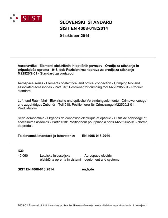 2003-01.Slovenski inštitut za standardizacijo. Razmnoževanje celote ali delov tega standarda ni dovoljeno.VWLVNDQMHLuft- und Raumfahrt - Elektrische und optische Verbindungselemente - Crimpwerkzeuge und zugehöriges Zubehör - Teil 018: Positionierer für Crimpzange M22520/2-01 - ProduktnormSérie aérospatiale - Organes de connexion électrique et optique - Outils de sertissage et accessoires associés - Partie 018: Positionneur pour pince à sertir M22520/2-01 - Norme de produitAerospace series - Elements of electrical and optical connection - Crimping tool and associated accessories - Part 018: Positioner for crimping tool M22520/2-01 - Product standard49.060Aerospace electric equipment and systemsICS:Ta slovenski standard je istoveten z:EN 4008-018:2014SIST EN 4008-018:2014en,fr,de01-oktober-2014SIST EN 4008-018:2014SLOVENSKI