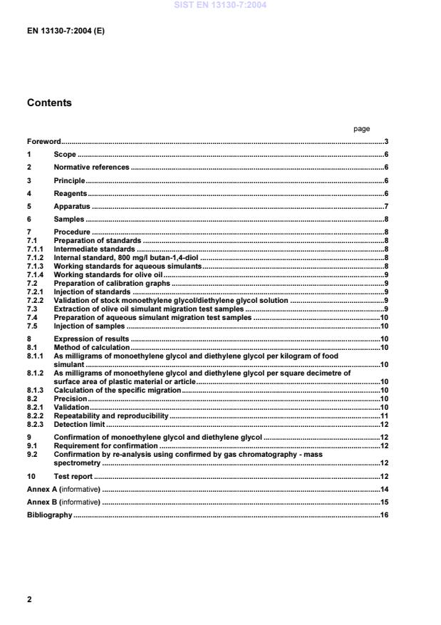 This part of this European Standard specifies methods for the determination of monoethylene glycol and diethylene glycol in the food simulants; water, 3 % w/v acetic acid, 15 % v/v ethanol and olive oil and other fatty food simulants, simulants D, e.g. a mixture of synthetic triglycerides or sunflower oil or corn oil. The methods are capable of determining monoethylene glycol and diethylene glycol in food simulants separately, or combined, at the specific migration limit SML (T) of 30 mg/kg. NOTE This method was developed for the determination of monoethylene glycol and diethylene glycol in 15 % v/v aqueous ethanol, as required by the regulations in force at the time the development work was carried out. However, this method, developed for 15 (v/v) aqueous ethanol, should be applicable to the determination in 10 (v/v) aqueous ethanol.