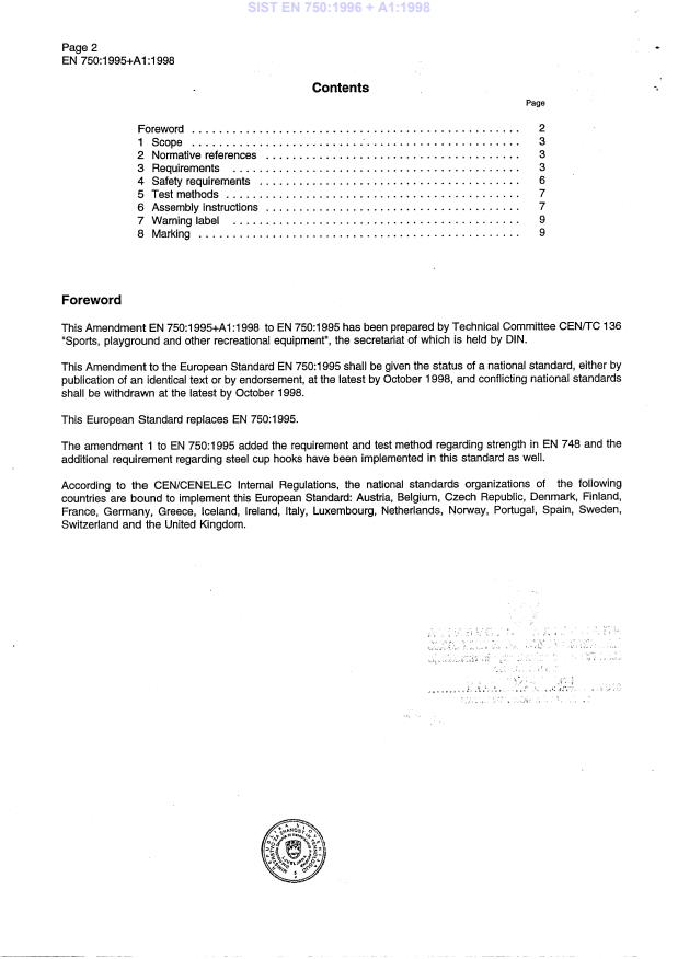 EN 750:1995 + A1:1998 is a standard published by the European Committee for Standardization (CEN). Its full title is "Playing field equipment - Hockey goals - Functional and safety requirements, test methods (including amendment 1:1998)". This standard covers: Migrated from Progress Sheet (TC Comment) (2000-07-10): Shortened UAP of 4 months (CC/970827)