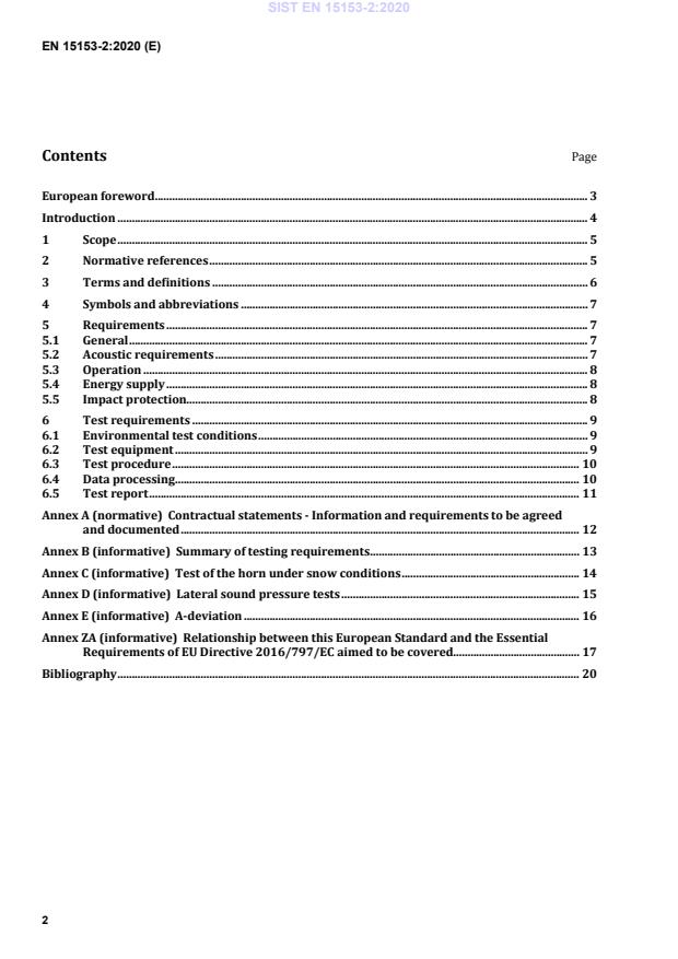 EN 15153-2:2020 is a standard published by the European Committee for Standardization (CEN). Its full title is "Railway applications - External visible and audible warning devices - Part 2: Warning horns for heavy rail". This standard covers: This document defines warning horn requirements that deliver the required audibility of approaching heavy rail vehicles. The requirements of this document do not apply to urban rail systems. NOTE 1 The requirements for exterior audible warning devices for urban rail vehicles are found in EN 15153 4. In the case of shunting heavy rail vehicle formations, the requirements of this document do not apply to the pushed vehicle(s). For this purpose, the following requirements are included: - functional and technical requirements of the warning horn as a component, - functional and technical requirements of the integration of warning horns into the vehicle, and - test requirements. Operational requirements and maintenance requirements for warning horns are excluded. NOTE 2 The requirements for the control of warning horns can be found in EN 16186 2.
