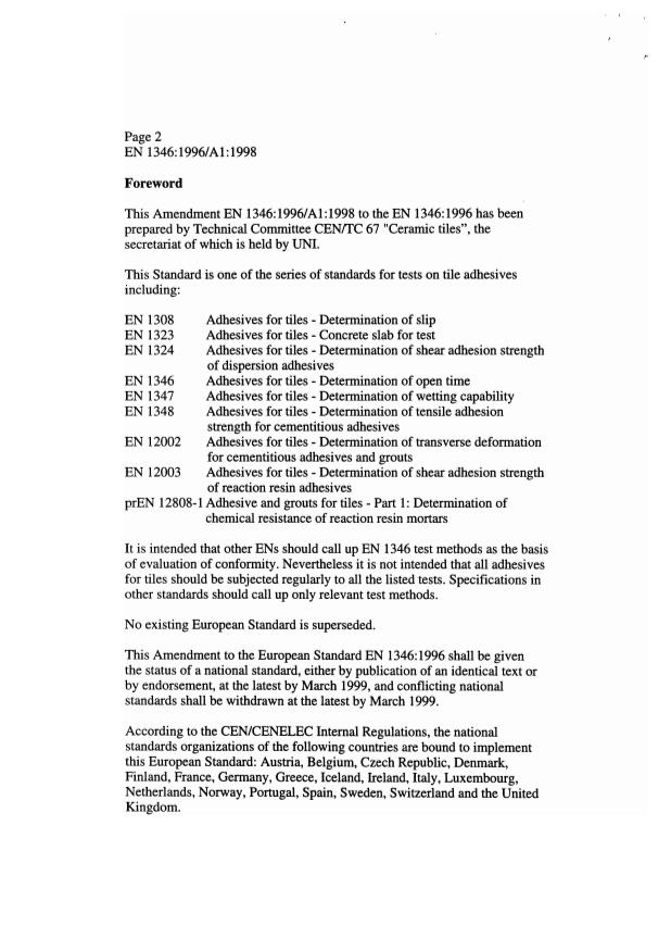 EN 1346:1996/A1:1998 is a amendment published by the European Committee for Standardization (CEN). Its full title is "Adhesives for tiles - Determination of open time". This standard covers: Migrated from Progress Sheet (TC Comment) (2000-07-10): UAP of 4 months (TC Res 1/1997) (CC/971007)