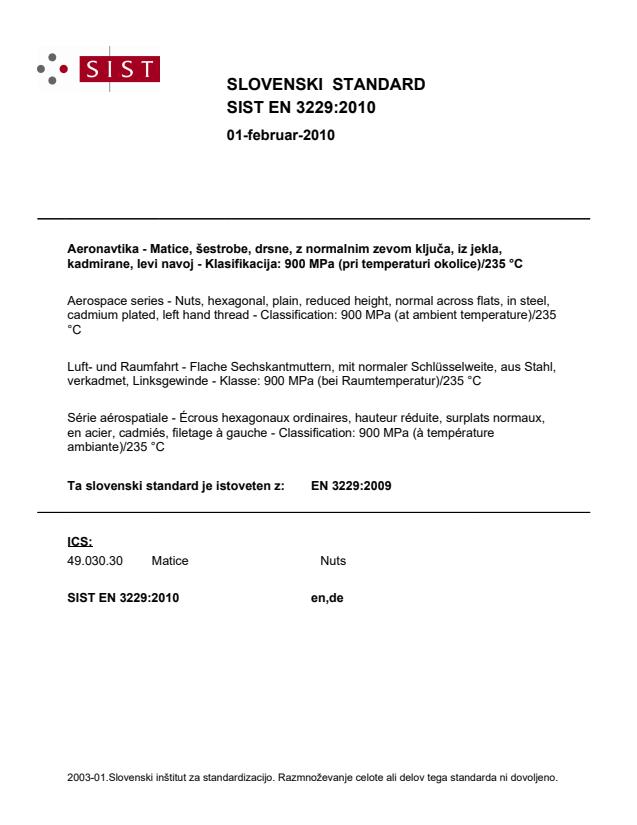 EN 3229:2009 is a standard published by the European Committee for Standardization (CEN). Its full title is "Aerospace series - Nuts, hexagonal, plain, reduced height, normal across flats, in steel, cadmium plated, left hand thread - Classification: 900 MPa (at ambient temperature) / 235 °C". This standard covers: This European Standard specifies the characteristics of plain, hexagonal nuts, reduced height, normal across flats, with left hand thread, in steel, cadmium plated. Classification: 900 MPa / 235 °C.