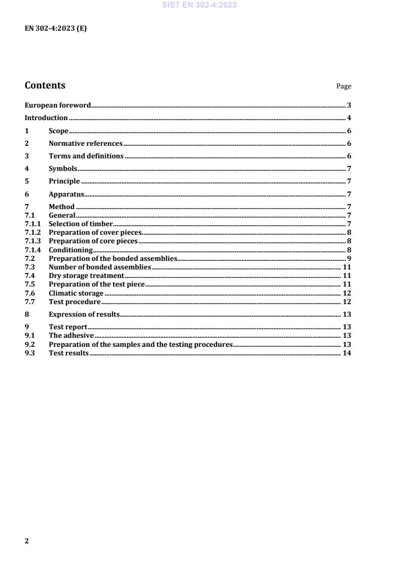 EN 302-4:2023 is a standard published by the European Committee for Standardization (CEN). Its full title is "Adhesives for load-bearing timber structures - Test methods - Part 4: Determination of the effects of wood shrinkage on the shear strength". This standard covers: This document specifies a method for determining the influence of shear strength in crosswise gluing by wood shrinkage under drying conditions. It is applicable for the following applications: a) for assessing the compliance of adhesives with EN 301, EN 15425, EN 16254, EN 17334 and EN 17418; b) for assessing the suitability and quality of adhesives for load-bearing timber structures; c) for determining if the adhesive is capable of withstanding stresses due to wood shrinkage without unacceptable loss of strength. This test is intended primarily to obtain performance data for the classification of adhesives for load-bearing timber structures according to their suitability for use in defined climatic environments. This test is carried out on Norway spruce (Picea abies L.). This method is not intended to provide data for structural design and does not necessarily represent the performance of the bonded member in service.