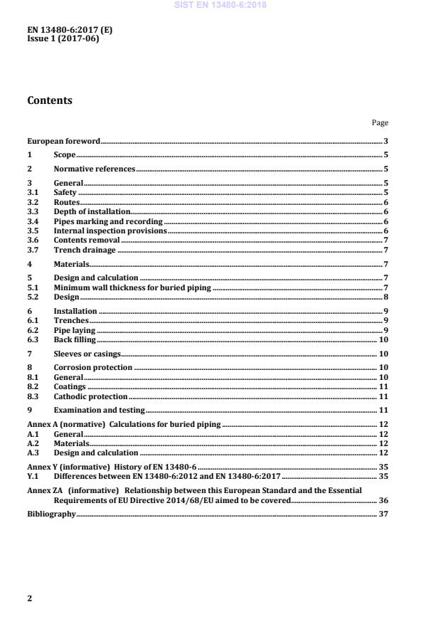 EN13480æ6:2017(E)Issue1(2017æ06)2ContentsFPageFEuropeanforeword.3 1Scope.5 2Normativereferences.5 3General.5 3.1Safety.5 3.2Routes.6 3.3Depthofinstallation.6 3.4Pipesmarkingandrecording.6 3.5Internalinspectionprovisions.6 3.6Contentsremoval.7 3.7Trenchdrainage.7 4Materials.7 5Designandcalculation.7 5.1Minimumwallthicknessforburiedpiping.7 5.2Design.8 6Installation.9 6.1Trenches.9 6.2Pipelaying.9 6.3Backfilling.10 7Sleevesorcasings.10 8Corrosionprotection.10 8.1General.10 8.2Coatings.11 8.3Cathodicprotection.11 9Examinationandtesting.11 AnnexA(normative)Calculationsforburiedpiping.12 A.1General.12 A.2Materials.12 A.3Designandcalculation.12 AnnexY(informative)HistoryofEN13480æ6.35 Y.1DifferencesbetweenEN13480æ6:2012andEN13480æ6:2017.35 AnnexZA(informative)RelationshipbetweenthisEuropeanStandardandtheEssentialRequirementsofEUDirective2014/68/EUaimedtobecovered.36 Bibliography.37 FFFSIST EN 13480-6:2018