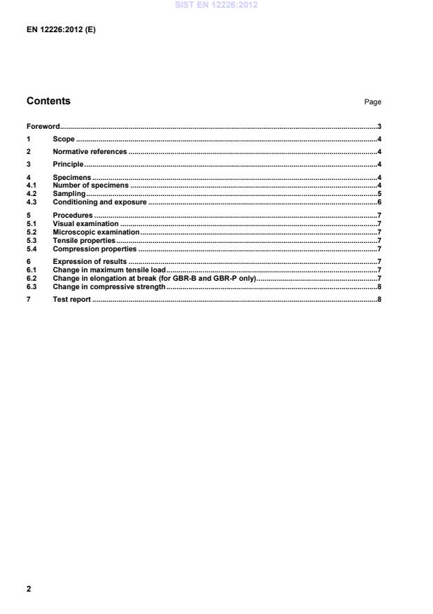 Guidelines for the assessment of durability 3 Principle The test specimens are exposed to a durability test for geosynthetics. The exposure is followed by visual and, if required, microscopic inspection and by determination of changes in tensile or compressive properties, as appropriate. NOTE For further information on relevant durability tests see ISO/TS 13434. 4 Specimens 4.1 Number of specimens For each durability test the number of test and control specimens shall be a minimum of five, in both the machine and the cross-direction, unless the nature of the geosynthetic makes this inappropriate. SIST EN 12226:2012