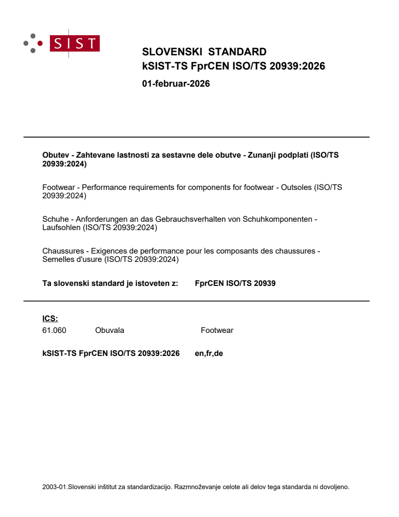 Obutev - Zahtevane lastnosti za sestavne dele obutve - Zunanji podplati (ISO/TS 20939:2024)