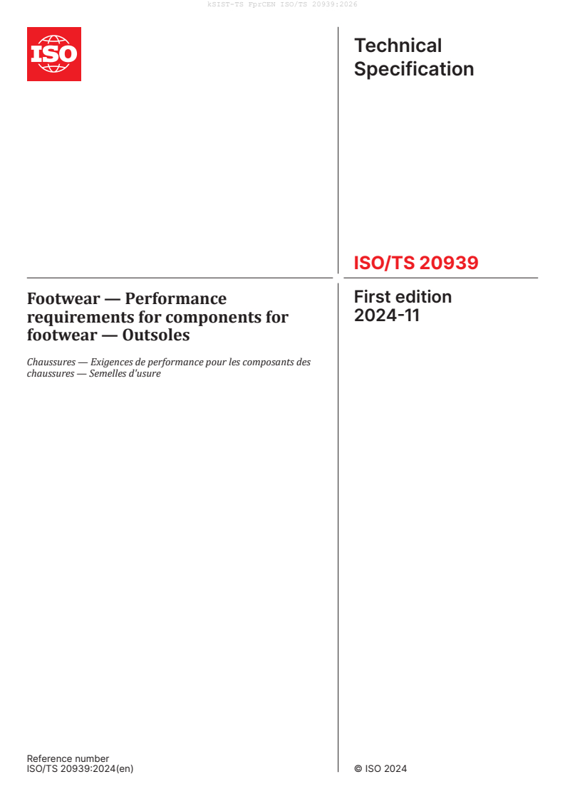 CEN ISO/TS 20939:2026 is a draft published by the European Committee for Standardization (CEN). Its full title is "Footwear - Performance requirements for components for footwear - Outsoles (ISO/TS 20939:2024)". This standard covers: This document establishes the performance requirements for outsole components for footwear, in order to assess the suitability for the end use. It also establishes the test methods to be used to evaluate the compliance with the requirements. This document applies to outsoles for all kinds of footwear as defined in Table 1. This document can be used as a reference by the footwear manufacturer and the supplier