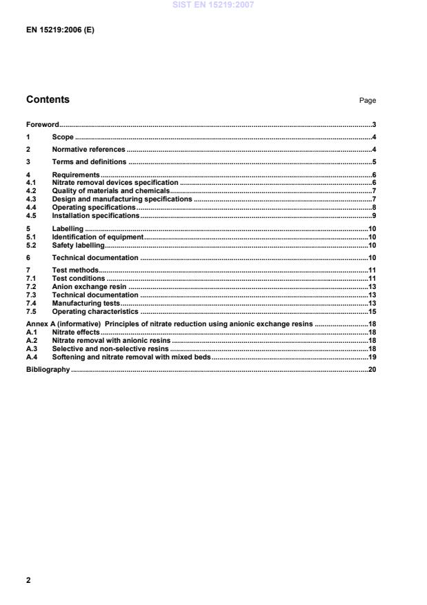 EN 15219:2006 is a standard published by the European Committee for Standardization (CEN). Its full title is "Water equipment inside buildings - Nitrate removal devices - Requirements for performance, safety and testing". This standard covers: This European Standard specifies requirements relating to the construction and mode of operation and relevant methods for testing automatic, salt-regenerated, anion exchange nitrate removal devices for drinking water installations inside buildings, which are permanently connected to the mains supply. NOTE Products intended for use in water supply systems are to comply, when existing, with national regulations and testing arrangements that ensure fitness for contact with drinking water. The Member State’s relevant regulators and the EC Commission agreed on the principle for a future unique European Acceptance Scheme (EAS) which would provide a common testing and approval arrangement at European level. If and when the EAS is adopted, European Standards on products will be amended by the addition of an Annex Z/EAS under Mandate M/136, which will contain formal references to the testing, certification and product marking requirements of the EAS. Until the EAS comes into force, the current national regulations remain applicable.