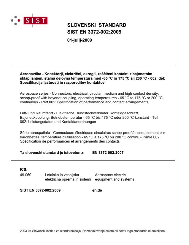 2003-01.Slovenski inštitut za standardizacijo. Razmnoževanje celote ali delov tega standarda ni dovoljeno.Luft- und Raumfahrt - Elektrische Rundsteckverbinder, kontaktgeschützt, Bajonettkupplung, Betriebstemperatur - 65 °C bis 175 °C oder 200 °C konstant - Teil 002: Leistungsdaten und KontaktanordnungenSérie aérospatiale - Connecteurs électriques circulaires scoop-proof à accouplement par baïonnettes, température d'utilisation - 65 °C à 175 °C ou 200 °C continu - Partie 002 : Spécification de performances et arrangements des contactsAerospace series - Connectors, electrical, circular, medium and high contact density, scoop-proof with bayonet coupling, operating temperatures - 65 °C to 175 °C or 200 °C continuous - Part 002: Specification of performance and contact arrangements49.060Aerospace electric equipment and systemsICS:Ta slovenski standard je istoveten z:EN 3372-002:2007SIST EN 3372-002:2009en,de01-julij-2009SIST EN 3372-002:2009SLOVENSKI