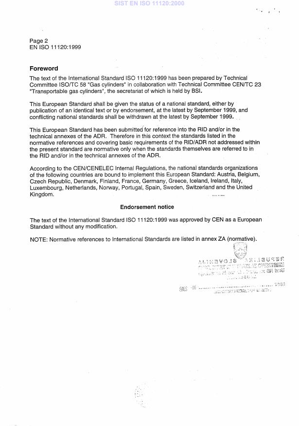 EN ISO 11120:1999 is associated with the following European legislation: EU Directives/Regulations: 94/55/EC, 96/49/EC, 96/86/EC, 96/87/EC, TRRTP121; Standardization Mandates: M/086. When a standard is cited in the Official Journal of the European Union, products manufactured in conformity with it benefit from a presumption of conformity with the essential requirements of the corresponding EU directive or regulation.