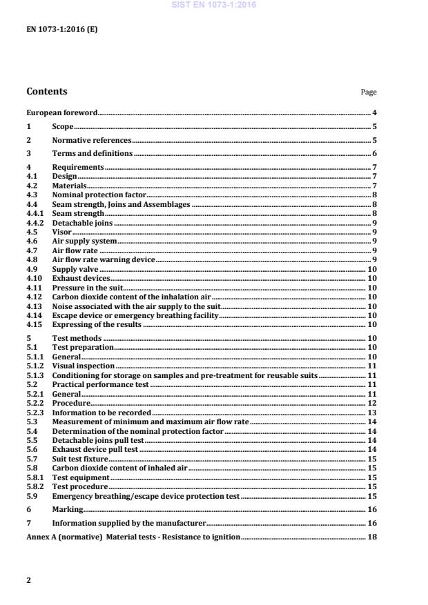 Total inward leakage test . 19 B.1 Principle . 19 B.2 Test subjects . 19 B.3 Sodium chloride aerosol . 19 B.3.1 Aerosol generator . 19 B.3.2 Test agent . 19 B.3.3 Detection . 19 B.3.4 Flame photometer . 20 B.3.5 Sample pump . 20 B.3.6 Sampling of chamber concentration . 20 B.4 Sampling . 21 B.4.1 General . 21 B.4.2 Sampling probes for the body and the challenge concentration . 21 B.4.3 Sampling probe for the respiratory area . 22 B.4.4 Position of sampling probes during the test . 23 B.4.5 Collecting device used for a simultaneous extraction of the air from the 3 sampling probes located in the suit . 24 B.4.6 Sampling lines . 24 B.5 Test chamber . 24 B.6 Treadmill . 25 B.7 Pressure detection probe . 25 B.8 Test procedure . 25 B.9 Assessment of results . 26 Annex C (normative)
