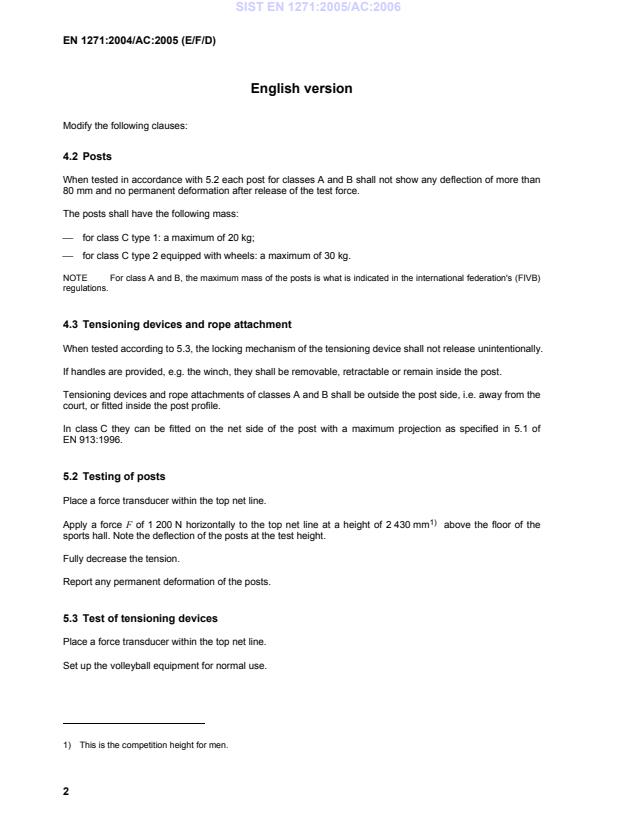 EN 1271:2004/AC:2005 is a corrigendum published by the European Committee for Standardization (CEN). Its full title is "Playing field equipment - Volleyball equipment - Functional and safety requirements, test methods". This standard covers: TC - Modification to 4.2, 4.3, 5.2 and 5.3