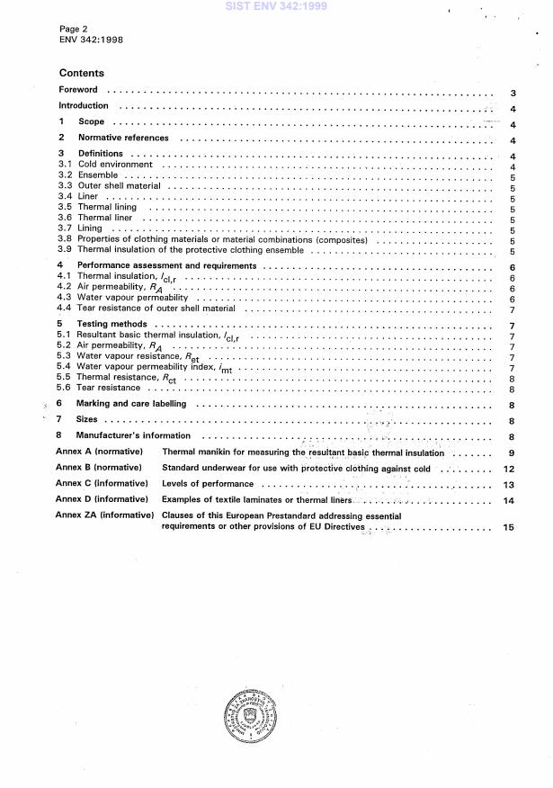 ENV 342:1998 is a standardization document published by the European Committee for Standardization (CEN). Its full title is "Protective clothing - Ensembles for protection against cold". This standard covers: This European Prestandard specifies requirements and test methods for performance of clothig ensembles (i.e. two piece suits and coveralls) for protection against cold environment. It does not include specific requirements for head wear, footwear and gloves intended to prevent local cooling.