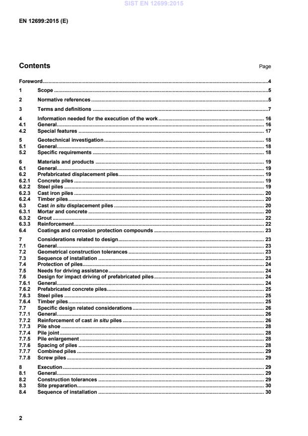 EN 12699:2015 is a standard published by the European Committee for Standardization (CEN). Its full title is "Execution of special geotechnical works - Displacement piles". This standard covers: 1.1 This European Standard establishes general principles for the execution of displacement piles, that means piles which are installed in the ground without excavation or removal of material from the ground except for limiting heave and/or limiting vibration as well as removal of obstructions or to assist penetration. Piles are driven into the ground using impact, vibration, pressing, screwing or a combination of these methods. 1.2 The material of displacement piles covered by this European Standard can be: - steel; - cast iron; - concrete, mortar; - timber; - grout; - combination of above. 1.3 This European Standard covers prefabricated, cast in situ, or a combination of these methods to form displacement piles of regular shape. Examples are given in Figure A.2 and Figure A.3. 1.4 Displacement piles may be installed in soils enhanced by ground improvement techniques. The ground improvement can be executed before, at the same time or after installation of the piles. 1.5 Other than practical considerations there are for the purpose of this European Standard no limitations regarding cross section dimensions, shaft or base enlargements, length or rake. 1.6 The provisions of this European Standard apply to: - single piles; - pile groups; - concrete sheet piles. 1.7 Columns constructed by ground improvement techniques (such as mixed in situ columns, jet grouting, compaction grouting, vibro flotation, stone columns) are not covered by this European Standard. Bored piles are covered in EN 1536. Steel and timber sheet pile walls are covered in EN 12063. Micropiles are covered in EN 14199.