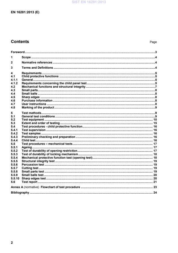 2 number of locking devices disengaged 4 limit line 1 Acceptable quality limit (AQL) = 5 %; limiting quality (LQ): 20 %; α = β = 5 %, where α is the producer’s risk; β is the consumer’s risk. NOTE For an enlargement of the chart scale, see Figure 1. Figure 2 — Chart of a sequential child test procedure (after demonstration) for locking devices 4.1.2.4 Full test If a sequential procedure is not used and the full number of children is tested, the results shall be assessed in accordance with the requirements laid down in 4.1.2.2. 4.1.2.5 Additional information to be recorded Any other information deemed to be useful in assessing the interpretation of the result, such as the time required for children to disengage the window's locking device and, where appropriate, to engage it properly, the method used by children to disengage it, etc. shall be recorded. 4.2 Mechanical functions and structural integrity The locking device should maintain its mechanical properties throughout its expected lifetime taking into account the relevant climate conditions. The manufacturer shall indicate the type(s) of window or balcony doors (e.g. hinged or sliding) including the materials (e.g. aluminium, PVC, wood) for which the locking device is suitable In particular, the manufacturer shall ensure that the fixing (e.g. screws) of the locking device is suitable for the recommended material(s). Suction cups shall not be used for the fixing of the locking device. When tested according to 5.5.2 to 5.5.7 none of the tested items or any part of the items shall be broken or have any visible cracks or permanent deformation or disengage. The devices shall be fully functional during and after the tests. When tested in accordance with 5.5.4, test probe A defined in 5.2.8 shall not be able to pass through the opening between sash and frame. NOTE Ideally, the locking device would automatically re-engage when closing the window after having been completely disengaged. However, at this point in time this is not a requirement. It may become a requirement in future. SIST EN 16281:2013