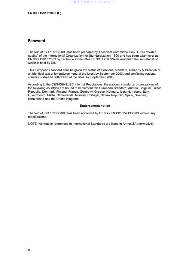 ISO15913:2000(E)iv©ISO2000–AllrightsreservedForewordISO(theInternationalOrganizationforStandardization)isaworldwidefederationofnationalstandardsbodies(ISOmemberbodies).TheworkofpreparingInternationalStandardsisnormallycarriedoutthroughISOtechnicalcommittees.Eachmemberbodyinterestedinasubjectforwhichatechnicalcommitteehasbeenestablishedhastherighttoberepresentedonthatcommittee.Internationalorganizations,governmentalandnon-governmental,inliaisonwithISO,alsotakepartinthework.ISOcollaboratescloselywiththeInternationalElectrotechnicalCommission(IEC)onallmattersofelectrotechnicalstandardization.InternationalStandardsaredraftedinaccordancewiththerulesgivenintheISO/IECDirectives,Part3.DraftInternationalStandardsadoptedbythetechnicalcommitteesarecirculatedtothememberbodiesforvoting.PublicationasanInternationalStandardrequiresapprovalbyatleast75%ofthememberbodiescastingavote.AttentionisdrawntothepossibilitythatsomeoftheelementsofthisInternationalStandardmaybethesubjectofpatentrights.ISOshallnotbeheldresponsibleforidentifyinganyorallsuchpatentrights.InternationalStandardISO15913waspreparedbyTechnicalCommitteeISO/TC147,Waterquality,SubcommitteeSC2,Physical,chemicalandbiochemicalmethods.AnnexesA,B,CandDofthisInternationalStandardareforinformationonly.SIST EN ISO 15913:2003