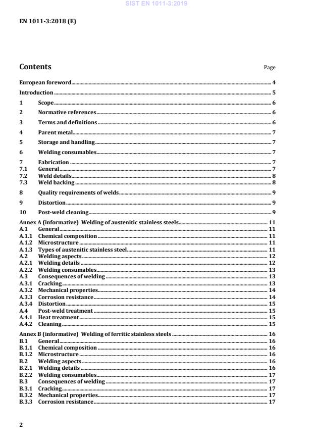 Welding of ferritic stainless steels . 16 B.1 General . 16 B.1.1 Chemical composition . 16 B.1.2 Microstructure . 16 B.2 Welding aspects . 16 B.2.1 Welding details . 16 B.2.2 Welding consumables . 17 B.3 Consequences of welding . 17 B.3.1 Cracking . 17 B.3.2 Mechanical properties . 17 B.3.3 Corrosion resistance . 17 SIST EN 1011-3:2019