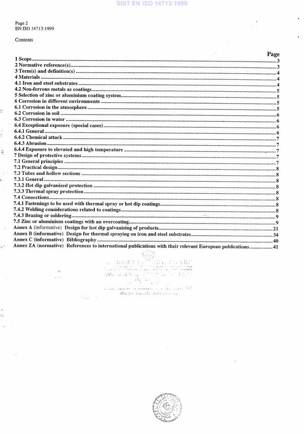 Diese europäische Norm beinhaltet einen Leitfaden bezüglich des Korrosionsschutzes von Eisen- und Stahlkonstruktionen einschließlich ihrer Verbindungsmittel durch Zink- oder Aluminiumüberzüge. Die Norm behandelt u.a. das Feuerverzinken und das Thermische Spritzen von warm- bzw. kaltgewalztem Stahl, ebenso können diese Empfehlungen für andere Arten von Zinküberzügen Anwendung finden (z.B. elektrolytische Verzinkung, mechanisches Plattieren, Sherardisieren usw.).