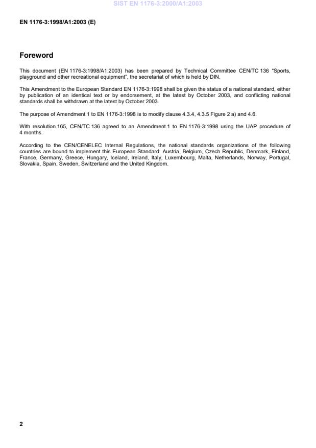 This amendment A1 modifies the European Standard EN 1176-3:1998; it was approved by CEN on 9 January 2003.