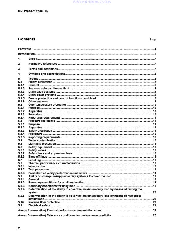 EN 12976-2:2006 is a standard published by the European Committee for Standardization (CEN). Its full title is "Thermal solar systems and components - Factory made systems - Part 2: Test methods". This standard covers: This European Standard specifies test methods for validating the requirements for Factory Made Thermal Solar Heating Systems as specified in EN 12976-1. The standard also includes two test methods for thermal performance characterization by means of whole system testing.
