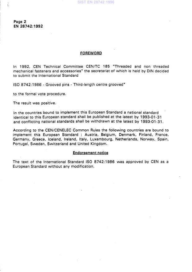 2003-01.Slovenski inštitut za standardizacijo. Razmnoževanje celote ali delov tega standarda ni dovoljeno.Knebelkerbstifte, 1/3 der Länge gekerbt (ISO 8742:1986)Goupilles cannelées a cannelures centrales constantes sur le tiers de la longueur non débouchantes (ISO 8742:1986)Grooved pins - Third-length centre grooved (ISO 87