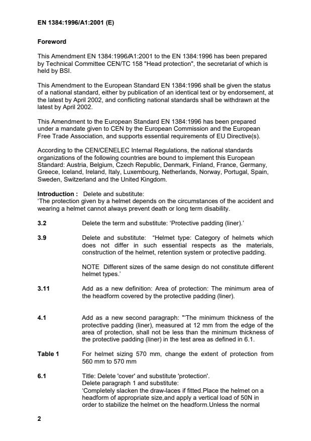 This Amendment EN 1384:1996/A1:2001 to the EN 1384:1996 has been prepared