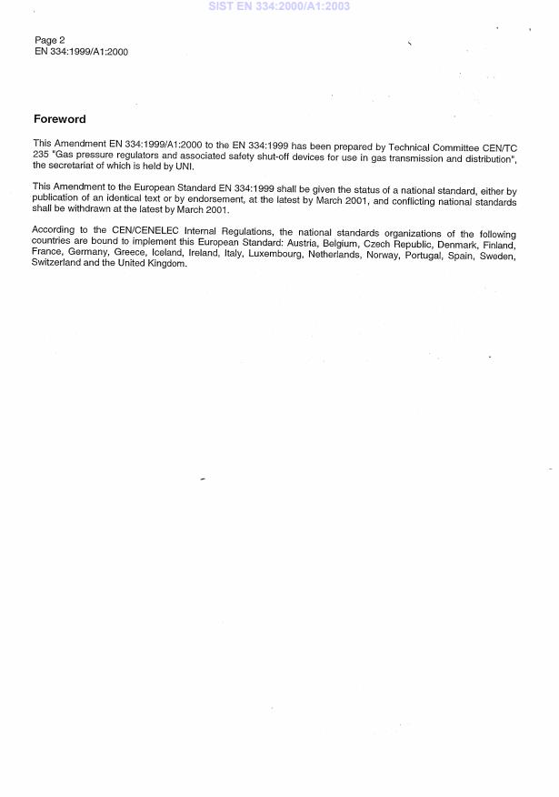 EN 334:1999/A1:2000 is a amendment published by the European Committee for Standardization (CEN). Its full title is "Gas pressure regulators for inlet pressures up to 100 bar". This standard covers: Migrated from Progress Sheet (TC Comment) (2000-07-10): UAP of 4 months (TC Res 6/1999) (CC/990831)