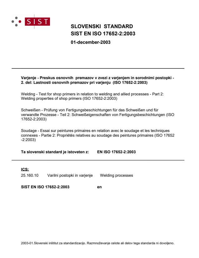 Varjenje - Preskus osnovnih premazov v zvezi z varjenjem in sorodnimi postopki - 2. del: Lastnosti osnovnih premazov pri varjenju (ISO 17652-2:2003)