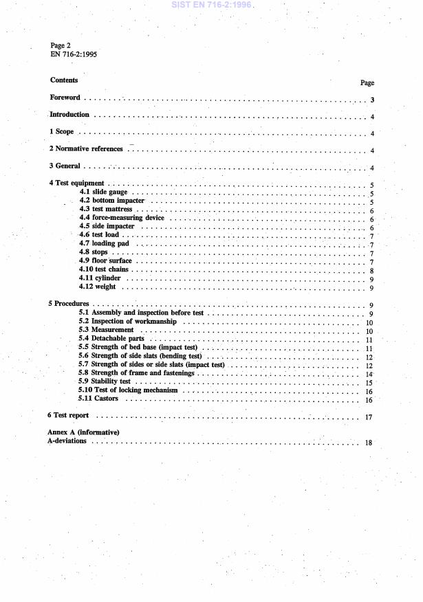 Dieser Teil der EN 716 legt Prüfverfahren fest, nach denen die Sicherheit von Kinderbetten im häuslichen Gebrauch bewertet wird. Er gilt für Betten mit einer Länge zwischen 900 und 1400 mm, die so konstruiert sind, daß Kinder am Herausklettern gehindert werden. Kinderbetten mit einer Schaukel- oder Schwingfunktion werden von dieser Norm nicht behandelt. Die Prüfungen sind so ausgelegt, daß sie an einem vollständig zusammengebauten und gebrauchsfertigen Bett durchgeführt werden.