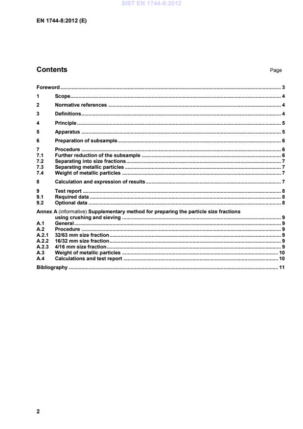 Ta evropski standard določa enostavno metodo pregledovanja agregatov MIBA za ocenjevanje relativnih mer kovinskih sestavnih delov. Ta evropski standard opisuje referenčne metode, ki se uporabljajo za preskušanje tipa in v primeru spora za ugotavljanje relativnih mer aluminijastih ali drugih kovinskih sestavnih delov agregatov MIBA. Za druge namene, zlasti za kontrolo proizvodnje, se lahko uporabijo druge metode, če obstaja primerna delovna povezava z referenčno metodo.