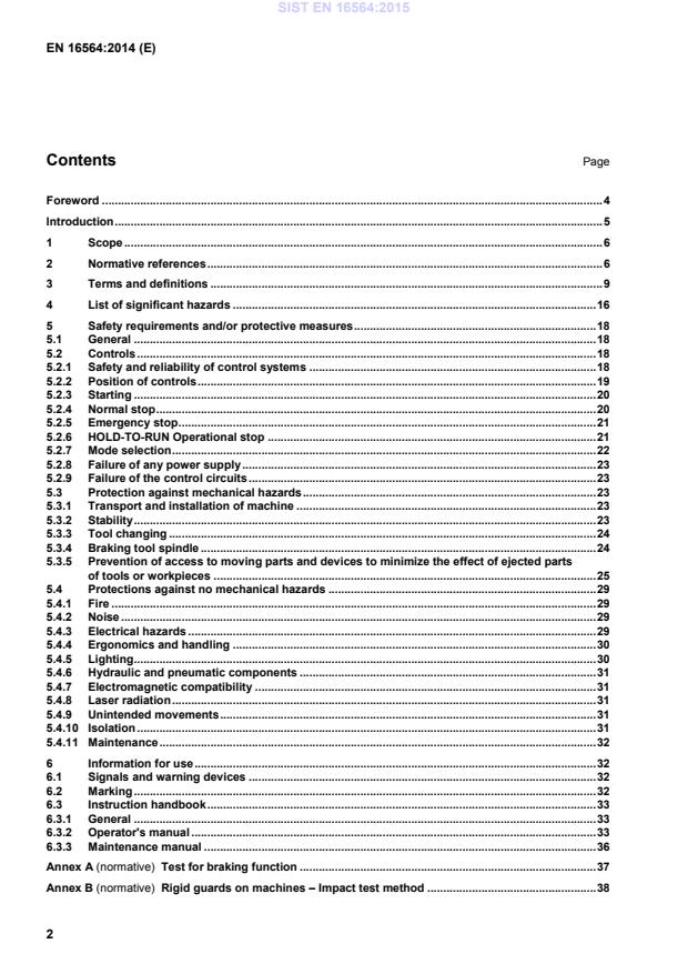 PL discrete level used to specify the ability of safety-related parts of control systems to perform a safety function under foreseeable conditions [SOURCE: EN ISO 13849-1:2008, 3.1.23, 4.5.1] 3.28 power enabling control device control device that enables providing power to machines actuators Note 1 to entry: E.g. powering auxiliary circuit. 4 List of significant hazards This clause contains all the significant hazards, hazardous situations and events, as indicated in EN ISO 12100:2010, Annex B, identified by risk assessment as significant for this type of machinery and which require action to eliminate or reduce the risk. Table 1 — List of significant hazards Type or group Origin Potential consequences Subclause of this document Mechanical hazards Approach of a moving element to a fixed part Crushing Impact 5.2.7, 5.2.8, 5.2.9, 5.3.5, 5.4.11 Cutting parts Cutting and shearing 5.3.3, 5.3.4, 5.3.5, 5.4.11 Elastic elements Crushing Impact 5.4.11 Gravity Falling objects Impact 5.3.1, 5.3.2 Instability Crushing Impact Being run over 5.3.1, 5.3.2 Kinetic energy Impact Being thrown 5.3.1, 5.3.3, 5.3.4, 5.3.5 Sharp edge Cutting and shearing 5.3.1, 5.3.3, 5.3.4, 5.3.5, 5.4.11 Moving elements Drawing-in Entanglement Being thrown 5.4.11 Rotating elements Cutting, Abrasion, Entanglement, Being thrown 5.3.3, 5.3.4, 5.3.5, 5.4.11 Vacuum Crushing Impact 5.3.5.6 SIST EN 16564:2015