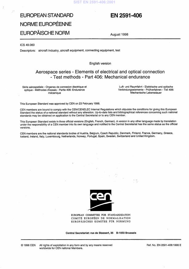 EN 2591-406:1998 is a standard published by the European Committee for Standardization (CEN). Its full title is "Aerospace series - Elements of electrical and optical connection - Test methods - Part 406: Mechanical endurance". This standard covers: This standard specifies a method of assessing the mechanical endurance of elements of connection without electrical load. It shall be used together with EN 2591.