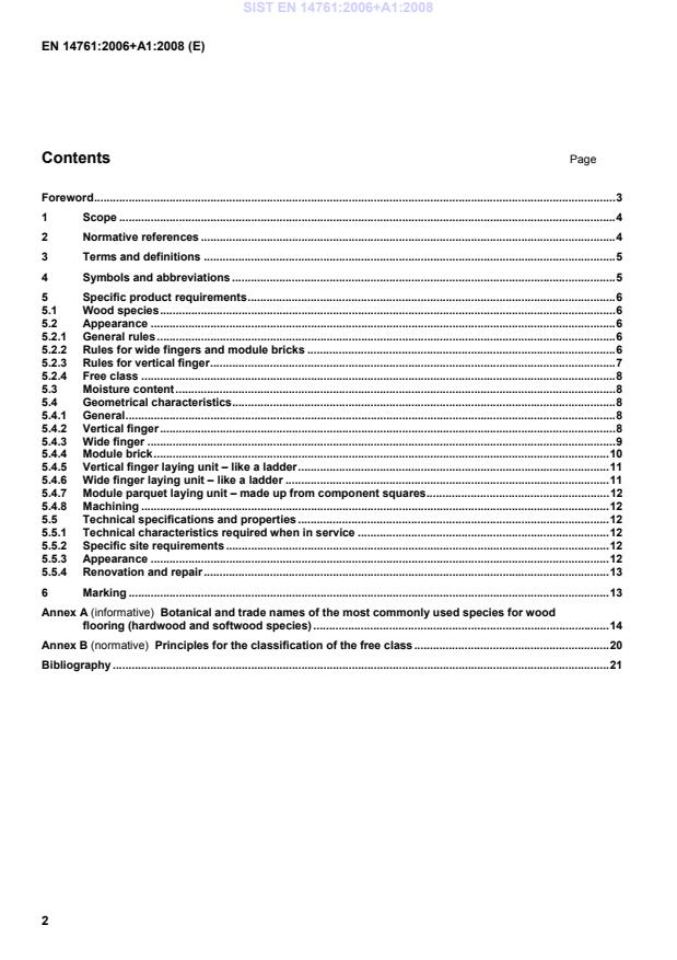 1 Scope This European Standard specifies the characteristics of solid vertical and wide finger as well as Module brick including the laying units made of softwood or hardwood for internal use as flooring. This standard covers products without surface treatments. This standard covers also treated or untreated elements. 2 Normative references The following referenced documents are indispensable for the application of this document. For dated references, only the edition cited applies. For undated references, the latest edition of the referenced document (including any amendments) applies. EN 844-1:1995, Round and sawn timber – Terminology – Part 1 : General terms common to round timber and sawn timber EN 844-3:1995, Round and sawn timber – Terminology – Part 3 : General terms relating to sawn timber EN 844-4:1997, Round and sawn timber – Terminology – Part 4 : Terms relating to structure content EN 844-6:1997, Round and sawn timber – Terminology – Part 6 : Terms relating to dimensions of sawn timber EN 844-7:1997, Round and sawn timber – Terminology – Part 7 : Terms relating to anatomical structure of timber EN 844-9:1997, Round and sawn timber – Terminology – Part 9 : Terms relating to features of sawn timber EN 844-10:1998, Round and sawn timber – Terminology – Part 10 : Terms relating to stain and fungal attack EN 844-11:1998, Round and sawn timber – Terminology – Part 11 : Terms relating to degrade by insects EN 844-12:2000, Round and sawn timber – Terminology – Part 12 : Additional terms and general index EN 1310, Round and sawn timber – Method of measurement of features EN 1534, Wood and parquet flooring - Determination of resistance to indentation (Brinell) - Test method EN 13183-1, Moisture content of a piece of sawn timber - Part 1: Determination by oven dry method EN 13183-2, Moisture content of a piece of sawn timber - Part 2: Estimation by electrical resistance method EN 13647, Wood and parquet flooring and wood panelling and cladding - Determination of geometrical characteristics EN 13756:2002, Wood flooring – Terminology EN 14342, Wood flooring – Characteristics, evaluation of conformity and marking SIST EN 14761:2006+A1:2008