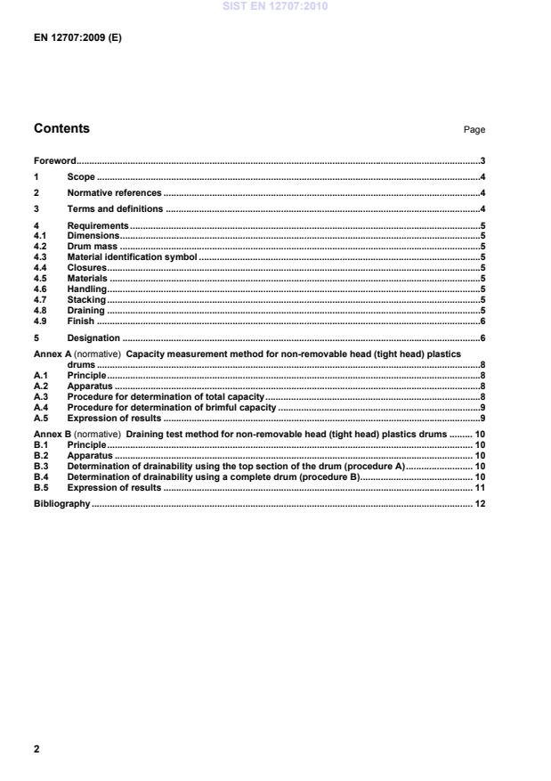 Draining test method for non-removable head (tight head) plastics drums . 10B.1Principle . 10B.2Apparatus . 10B.3Determination of drainability using the top section of the drum (procedure A) . 10B.4Determination of drainability using a complete drum (procedure B) . 10B.5Expression of results . 11Bibliography . 12 SIST EN 12707:2010