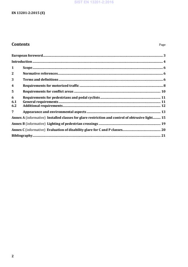 EN 13201-2:2015 is a standard published by the European Committee for Standardization (CEN). Its full title is "Road lighting - Part 2: Performance requirements". This standard covers: This part of this European Standard defines performance requirements which are specified as lighting classes for road lighting aiming at the visual needs of road users, and it considers environmental aspects of road lighting. NOTE Installed luminous intensity classes for the restriction of disability glare and control of obtrusive light and installed glare index classes for the restriction of discomfort glare are defined in the informative Annex A. Lighting of pedestrian crossings is discussed in the informative Annex B. Disability glare evaluation for conflict areas (C classes) and pedestrian and pedal cyclists (P classes) is discussed in the informative Annex C.