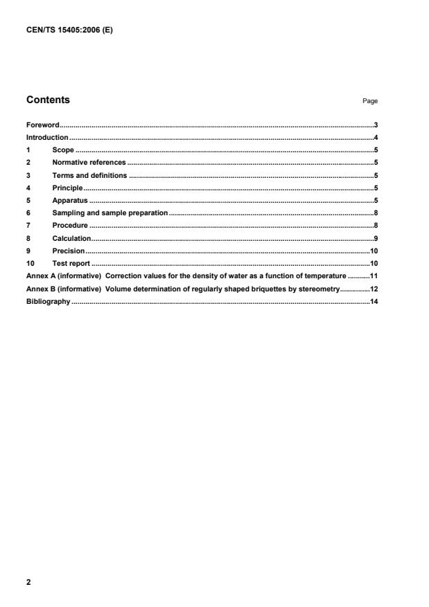CEN/TS 15405:2006 is a technical specification published by the European Committee for Standardization (CEN). Its full title is "Solid recovered fuels - Methods for the determination of density of pellets and briquettes". This standard covers: This Technical Specification specifies a method for the determination of particle density of irregularly shaped pieces of compressed fuels such as pellets or briquettes. NOTE Particle density is subject to variation due to the susceptibility of organic material to environmental or technical impacts such as air humidity, vibration, abrasion or biodegradation. Therefore, particle density can vary during time thus the measured values should be regarded as a momentary fuel property.
