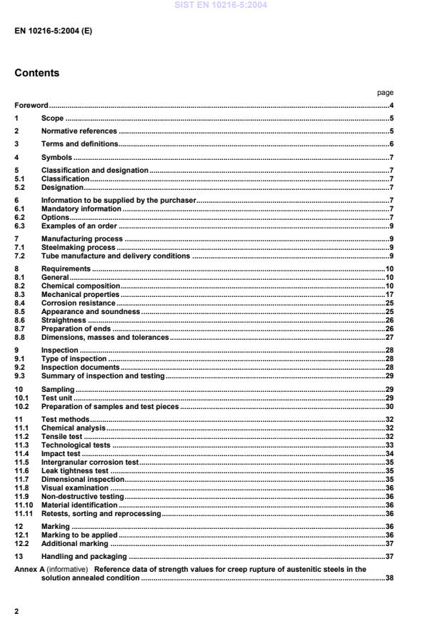 - X2CrNi19-11 - TC 1 6.3.2 Example 2 300 m of cold finished descaled seamless tube with an outside diameter of 42,4 mm, a wall thickness of 2,6 mm, in accordance with this part EN 10216, tolerance classes D 3 and T 3, made of steel grade 1.4301, to test category 2, with intergranular corrosion test (EN ISO 3651-2, method A), verification of proof strength at 300 °C, non-destructive testing for detection of longitudinal and transverse imperfections, with a 3.2 inspection certificate in accordance with EN 10204: 300 m - CFD Tube – 42,4 X 2,6 - EN 10216-5 - 1.4301 – TC 2 - Option 9: 300 °C – Option 12: A – Option 14 - Option 15 - Option 21: 3.2 7 Manufacturing process 7.1 Steelmaking process The steelmaking process is at the discretion of the manufacturer, but see option 1. Option 1: The purchaser shall be informed about the steelmaking process used. The process shall be reported in the inspection document. 7.2 Tube manufacture and delivery conditions 7.2.1 All NDT activities shall be carried out by qualified and competent level 1, 2 and/or 3 personnel authorised to operate by the employer. The qualification shall be in accordance with EN 10256 or, at least, an equivalent to it. It is recommended that the level 3 personnel be certified in accordance to EN 473 or, at least an equivalent to it. The operating authorisation issued by the employer shall be in accordance with a written procedure. NDT operations shall be authorised by a level 3 NDT individual approved by the employer. NOTE The definition of level 1, 2 and 3 can be found in appropriate standards, e.g. EN 473 and EN 10256. 7.2.2 The tubes shall be manufactured by a seamless process, and may be hot finished or cold finished. The terms “ hot finished “ and “ cold finished “ apply to the condition of the tube before it is heat treated in accordance with 7.2.3. The process of manufacture is left to the discretion of the manufacturer, but see option 2. SIST EN 10216-5:2004