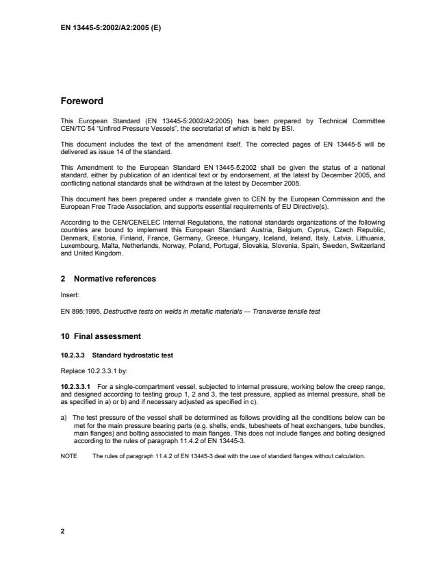 This amendment A2 modifies the European Standard EN 13445-5:2002; it was approved by CEN on 30 December 2004.