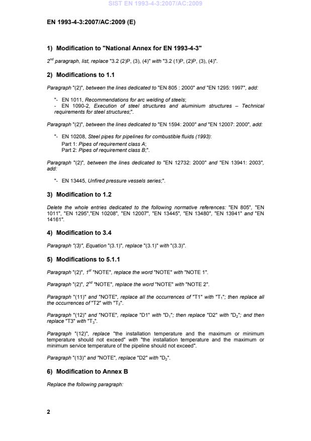 EN 1993-4-3:2007/AC:2009 is a corrigendum published by the European Committee for Standardization (CEN). Its full title is "Eurocode 3 - Design of steel structures - Part 4-3: Pipelines". This standard covers: TC - Modifications in "National annex for EN 1993-4-3", in Subclauses 1.1, 1.2, 3.4 and 5.1.1 and in Annex B. 2013: Originator of XML version: first setup pilot of CCMC in 2012