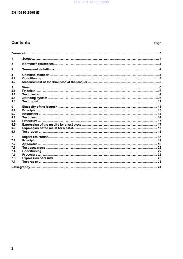 1 Scope This European Standard specifies a test method to determine the resistance to wear of lacquered wood floorings, a method to test the elasticity of the lacquer and a method to determine resistance to impact of lacquered wood floorings. 2 Normative references The following referenced documents are indispensable for the application of this document. For dated references, only the edition cited applies. For undated references, the latest edition of the referenced document (including any amendments) applies. EN 13756:2002, Wood flooring – Terminology