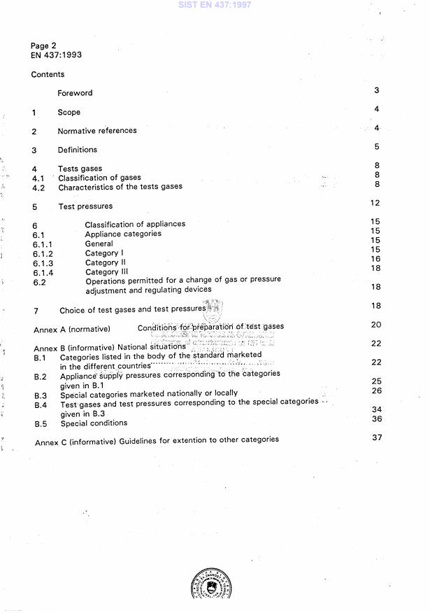 EN 437:1993 is a standard published by the European Committee for Standardization (CEN). Its full title is "Test gases - Test pressures - Appliance categories". This standard covers: This standard specifies the test gases, test pressures and categories of appliances relative to the use of combustible gases of the first, second and third families. It serves as a reference document in the specific standards for appliances that fall within the scope of the Council Directive on the approximation of the laws of Member States concerning gas appliances. The standard makes recommendations for the use of the gases and pressures to be applied for the tests. The full procedure will be given in the corresponding appliance standards. Note: The test gases and the test pressures specified in this standard are in principle intended to be used with all the appliances in order to establish conformity with the corresponding standards. However, the use of some test gases and test pressures may not be appropriate in the following cases: - appliances with nominal heat input greater than 300 kW; - appliances constructed on site; - appliances in which the final design is determined by the user; - appliances constructed for use with high supply pressures (notably direct use of the saturated vapour pressure). In these cases, the specific appliance standards may specify other conditions of test in order to establish conformity with their requirements.