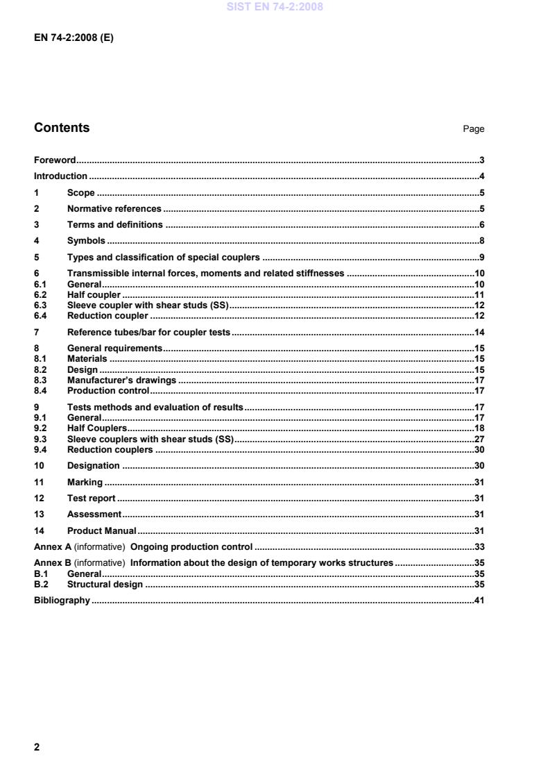 screw or wedge half couplers, sleeve couplers with shear studs, right angle reduction couplers and swivel reduction couplers. It gives recommendations for on-going production control. These couplers are for use principally in temporary works. Each coupler is able to be fixed to at least one side to one 48,3 mm diameter steel or aluminium tube. For the other side of reduction couplers, this standard specifies requirements for the diameter and wall thickness of tubes. For testing, screw couplers are tightened with a torque of 50 Nm and wedge couplers are tightened with a 500 g hammer until the jarring blow. Other special half couplers such as half couplers attached by riveting, used mainly for members of prefabricated scaffolds, are outside the scope of this European Standard. NOTE Information on design using special couplers is given in Annex B. 2 Normative references The following referenced documents are indispensable for the application of this document. For dated references, only the edition cited applies. For undated references, the latest edition of the referenced document (including any amendments) applies. EN 74-1:2005, Couplers, spigot pins and baseplates for use in falsework and scaffolds — Part 1: Couplers for tubes — Requirements and test procedures EN 1090-2:2008, Execution of steel structures and aluminium structures — Part 2: Technical requirements for steel structures EN 12811-1:2003, Temporary works equipment — Part 1: Scaffolds — Performance requirements and general design EN 12811-2:2004, Temporary works equipment — Part 2: Information on materials EN 12811-3:2002, Temporary works equipment — Part 3: Load testing EN ISO 898-1:1999, Mechanical properties of fasteners made of carbon steel and alloy steel — Part 1: Bolts, screws and studs (ISO 898-1:1999) SIST EN 74-2:2008