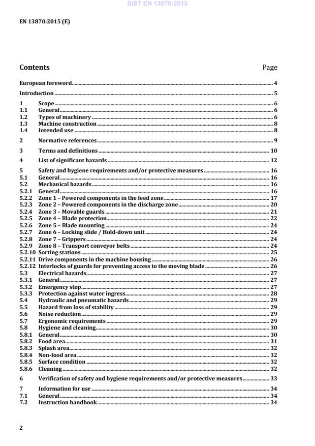 ¶ 200 mm. The closing speed shall not be more than 50 mm/s up to a minimum distance of 200 mm. — No handle may be mounted on force-operated guards that are locked by a retaining force. — If the drive energy fails (e.g. power failure, tube or hose breakage), the movement of the force-operated guard shall be interrupted if a crushing force of 135 N is exceeded. Safety relevant parts of the control shall correspond to the requirements from EN ISO 13849-1. — Non-contact protective device as closing edge protection. — In the case of safety guards that swivel upwards and under which the operator has to enter, the minimum height under the opened guard shall be 1 800 mm. Impact edges and corners may not have sharp edges. — Information in the instruction handbook: The manufacturer shall describe the safety working procedures which the operator has to follow in the instruction handbook. These methods of working shall be a component of the training that the operator shall fulfil. 5.2.5 Zone 4 – Blade protection 5.2.5.1 General Cutting tools have to be removed periodically. Cutting tools are sharp and special protective measures shall be taken. For such blades, designers shall provide means of attaching a tool to the blade to avoid hand contact: and a box, or surround guard, to protect against the sharp edges of the blade during handling and transportation. Explanations on the use of these protective means shall be included in the instruction handbook. Injuries due to cutting or piercing when working with the blade or when the blade is stationary shall be prevented. This is achieved by e.g. the following measures: — A blade protection shall be used for installation, removal and transport of the blade. — The manufacturer shall describe the residual risks when working with the blade and during all work in the area of the blade, especially during cleaning and maintenance, in the instruction handbook. The use and handling of the blade protection shall be described in the instruction handbook. SIST EN 13870:2015