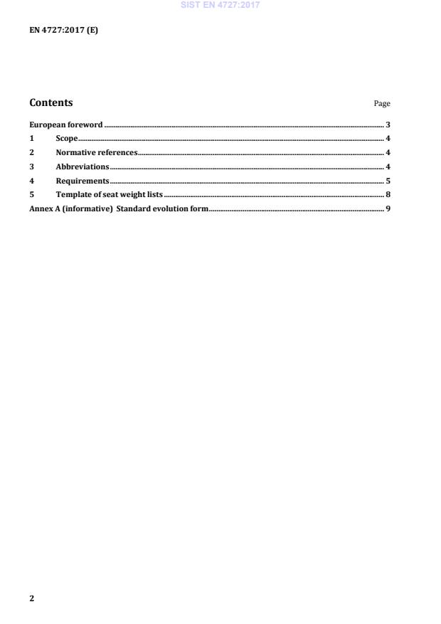 EN 4727:2017 is a standard published by the European Committee for Standardization (CEN). Its full title is "Aerospace series - Standardized passenger seat weight information". This standard covers: The weight for cabin equipment is an important topic in the aviation business. The cabin equipment weight has a direct impact on the payload of the aircraft, operation cost and revenue of the airlines. Due to the number of aircraft seats, seats are one of the major weight drivers in the cabin. At this time, a lot of seat weights are used without any clear definition, e.g. allowable max. weight, certified weight, defined weight. For the definition of each customer specific cabin, it is important to get comparable seat weights. Aircraft seats are very different with regard to seat envelope dimensions and integrated features and options. For a weight calculation and product comparison, it is very helpful to get comparable weight information based on a standard weight. The aim of this European Standard is to define a clear definition for the different weight information and a baseline for a seat weight calculation to get comparable seat weights for seat brochures and marketing reasons.