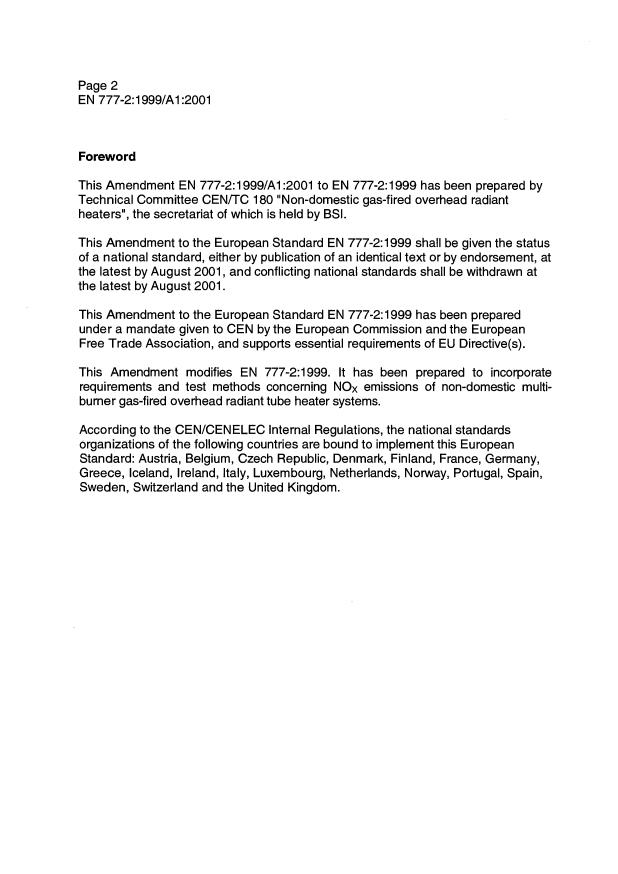 EN 777-2:1999/A1:2001 is a amendment published by the European Committee for Standardization (CEN). Its full title is "Multi-burner gas-fired overhead radiant tube heater systems for non-domestic use - Part 2: System E, safety". This standard covers: This amendment modifies EN 777-2:1998. It has been prepared to incorporate requirements and test methods concerning NOx emissions of non-domestic gas-fired overhead radiant tube heaters.