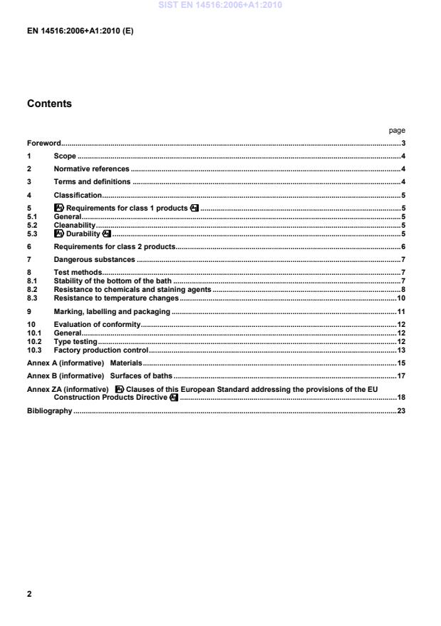 5.3.4 Resistance to temperature changes When tested in accordance with !8.3", all baths shall show no evidence of distortion or other defects, e.g. crazing, which will impair their cleanability. Experience has shown that baths manufactured from the stainless steel grades listed in Annex A, enamelled steel, enamelled cast iron and glazed ceramics comply with this requirement. !deleted text" ! 6 Requirements for class 2 products 6.1 General The manufacturer shall provide instructions with each bath covering installation and care. NOTE Annex B gives advice which manufacturers can include in their instructions. SIST EN 14516:2006+A1:2010
