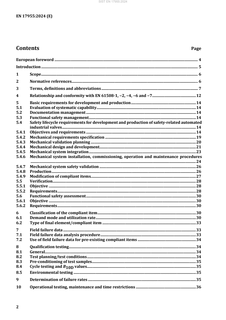 The standard SIST EN 17955:2024 offers a comprehensive framework for assessing the functional safety of safety-related automated valves, addressing a crucial aspect of industrial valve operation. Its clear scope is designed to outline the requirements necessary for evaluating mechanical compliant items within a final element, based on the principles outlined in EN 61508. This relevance is paramount as industries increasingly rely on automation and the safety of their operations. One of the key strengths of this standard lies in its systematic approach to minimizing systematic faults, thereby facilitating the achievement of a targeted Safety Integrity Level (SIL). By identifying and evaluating all relevant factors associated with the product, the standard provides users with an essential method for ensuring the consistent safety and reliability of their automated valves. This is particularly vital for applications where safety is paramount, as it directly correlates with the integrity of entire safety-related systems. The standard's application extends to a variety of compliant items, including standalone valves, actuators, and even complex assemblies comprising interconnecting components. This versatility allows for a broader implementation of the guidelines, helping manufacturers and engineers to enhance the safety protocols of their existing systems. Furthermore, while it primarily addresses mechanical components, it appropriately specifies that electrical, electronic, or programmable electronic components should be evaluated in line with EN 61508, ensuring a holistic approach to functional safety. Another significant aspect of SIST EN 17955:2024 is its explicit definition of exclusions, such as manually operated valves and items that do not conform to functional safety principles-notably, automatic safety valves like pressure relief valves. This clarity ensures that users are aware of the limitations of the standard, thereby preventing misapplication and fostering a more focused approach to compliance and safety advancements. Overall, the relevance of SIST EN 17955:2024 cannot be overstated. As industries continue to evolve with technological advancements, the need for comprehensive safety standards such as this will become increasingly critical to ensure both efficiency and safety in the operation of automated valves. The document serves as a pivotal resource for achieving the necessary safety measures in industrial applications, reinforcing its importance in the field of functional safety.
