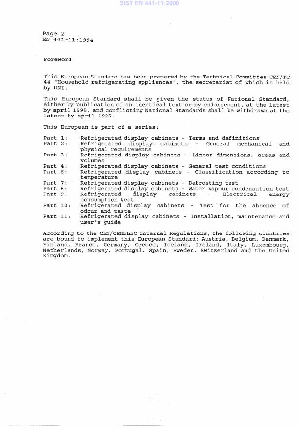 EN 441-11:1994 is a standard published by the European Committee for Standardization (CEN). Its full title is "Refrigerated display cabinets - Part 11: Installation, maintenance and user's guide". This standard covers: This standard specifies marking and performance requirements, methods of classification, methods of determining dimensions and methods of test for commercial refrigerated cabinets for the sale and display of food products. This standard does not cover refrigerated vending machines. This part gives information concerning the installation and maintenance of commercial refrigerated cabinets and is a guide to users.