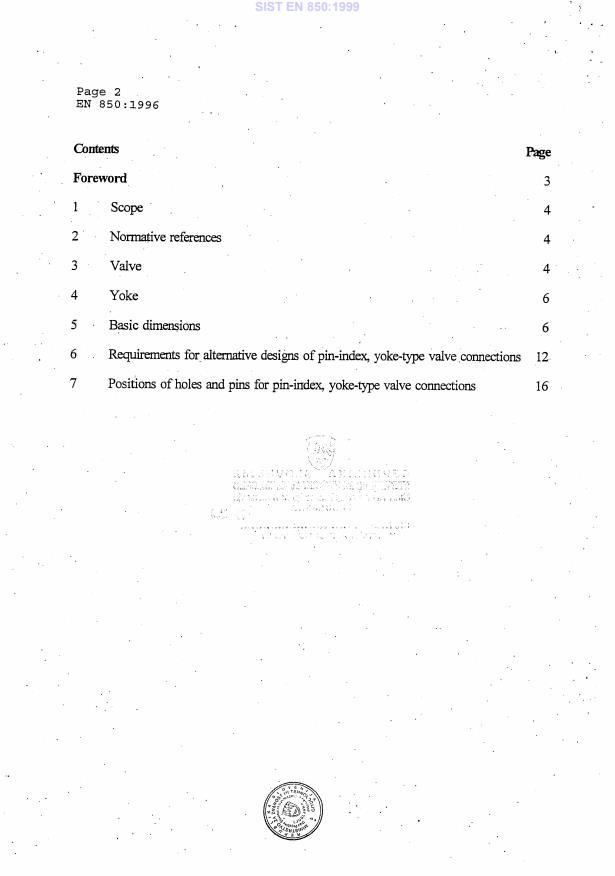 EN 850:1996 is a standard published by the European Committee for Standardization (CEN). Its full title is "Transportable gas cylinders - Pin-index, yoke-type valve outlet connections for medical use". This standard covers: This European Standard applies to pin-index, yoke-type valve outlet connections for medical use, up to a maximum working pressure of 250 bar at 15 °C. These connections are for use with medical gas cylinders of water capacity below 5 l, for patient care, including therapeutic, diagnostic and prophylactic applications, in hospitals and for emergency treatment. It specifies: - basic dimensions; - requirements for alternative designs of pin-index, yoke-type valve connections; - dimension and positions for the holes and pins for the outlet connections for certain gases and gas mixtures.