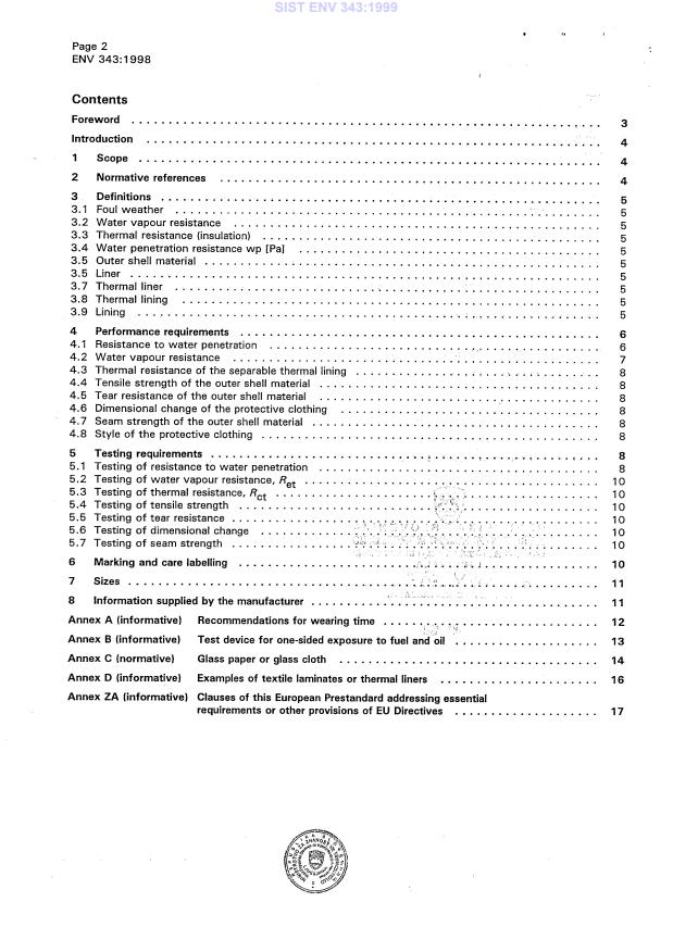 ENV 343:1998 is a standardization document published by the European Committee for Standardization (CEN). Its full title is "Protective clothing - Protection against foul weather". This standard covers: This European prestandard specifies requiremets and test methods applicable to materials and seams of protective clothing against the influence of foul weather as defined in [clause] 3.1. The protective clothing may be proposed and/or used in combination with a thermal lining, but the aforementioned requirements and test methods only apply when the thermal lining is separable from the outer garment of the proposed protective clothing.